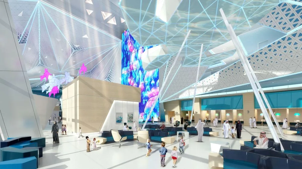 The King Hussein Cancer Center includes sensory zones with adjustable lighting for circadian alignment, textured walls for tactile engagement, and calming soundscapes to create a soothing environment for patients with cognitive or sensory sensitivities.