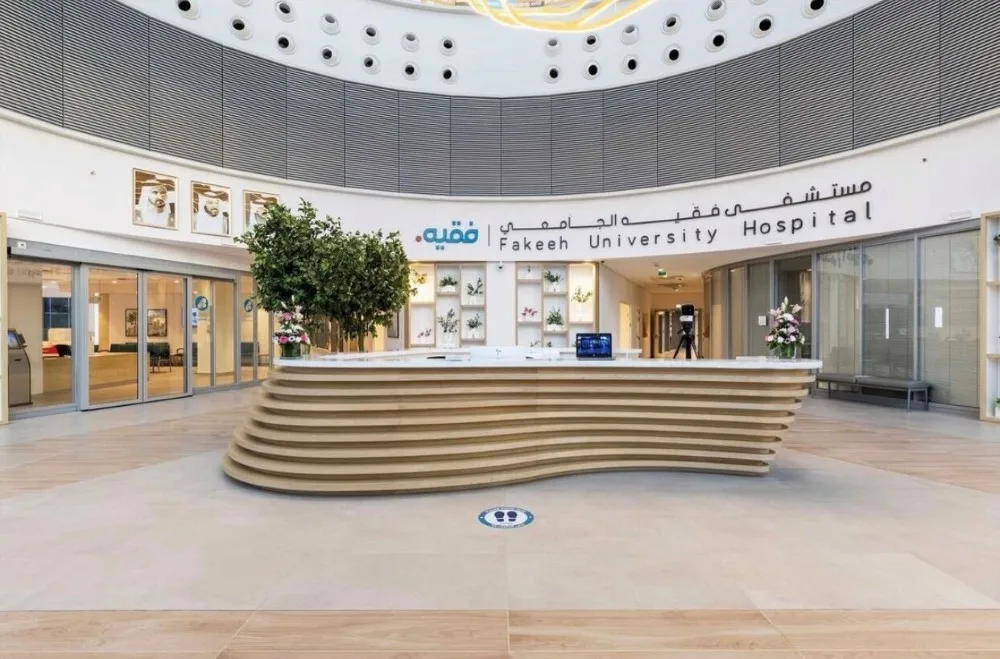 Fakeeh University Hospital is a LEED-certified healthcare facility that uses solar panels, energy-efficient HVAC systems, and non-toxic, antimicrobial surfaces. Its green building practices reduce environmental impact and operational costs while ensuring patient safety.