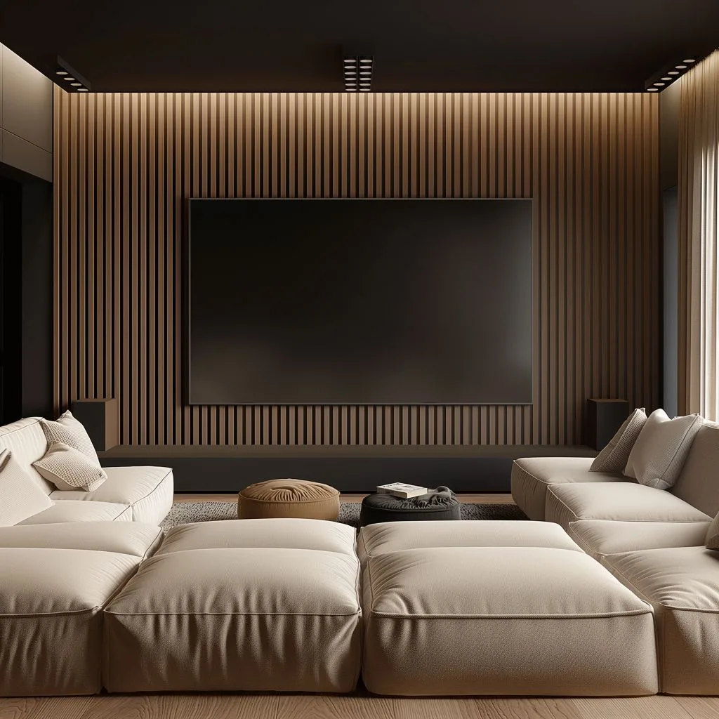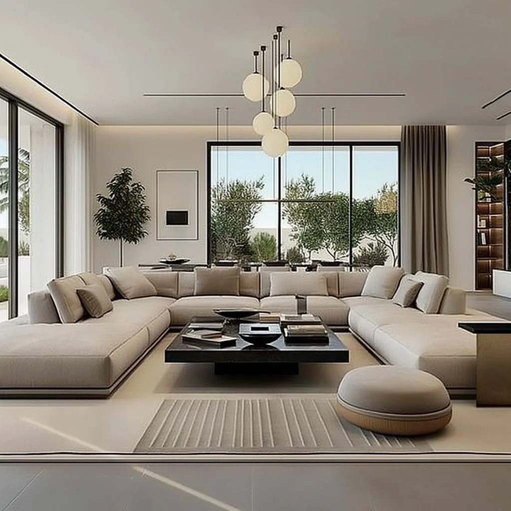 The design style perfectly balances neutral tones with sleek black lines, creating a sophisticated, comfortable, and visually striking space. Large, comfy furniture invites relaxation, while high-end materials and thoughtful design details underscore the luxurious feel of the interior.